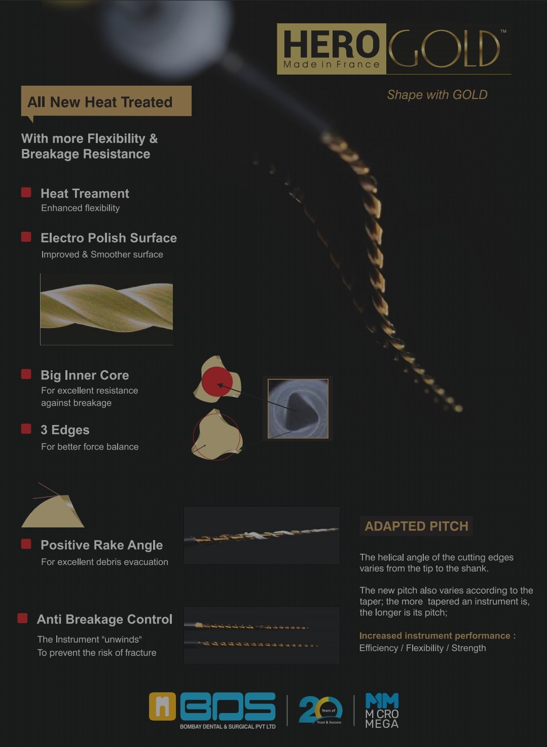 Herogold files are one of the latest rotary endodontic files used in root canal treatment. These new endodontic rotary files were manufactured keeping in mind the limitations of conventional shape memory rotary files in endodontics. Herogold Files undergo a specialized heat treatment process to give them unique flexibility characteristics. It has a positive rake angle (For excellent debris evacuation), big inner core (For excellence resistance to breakage) and 3 edges (for better force balance).