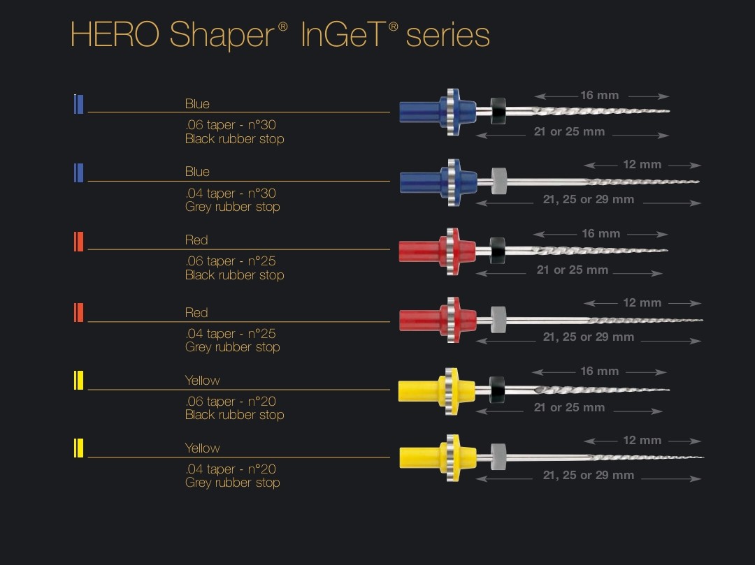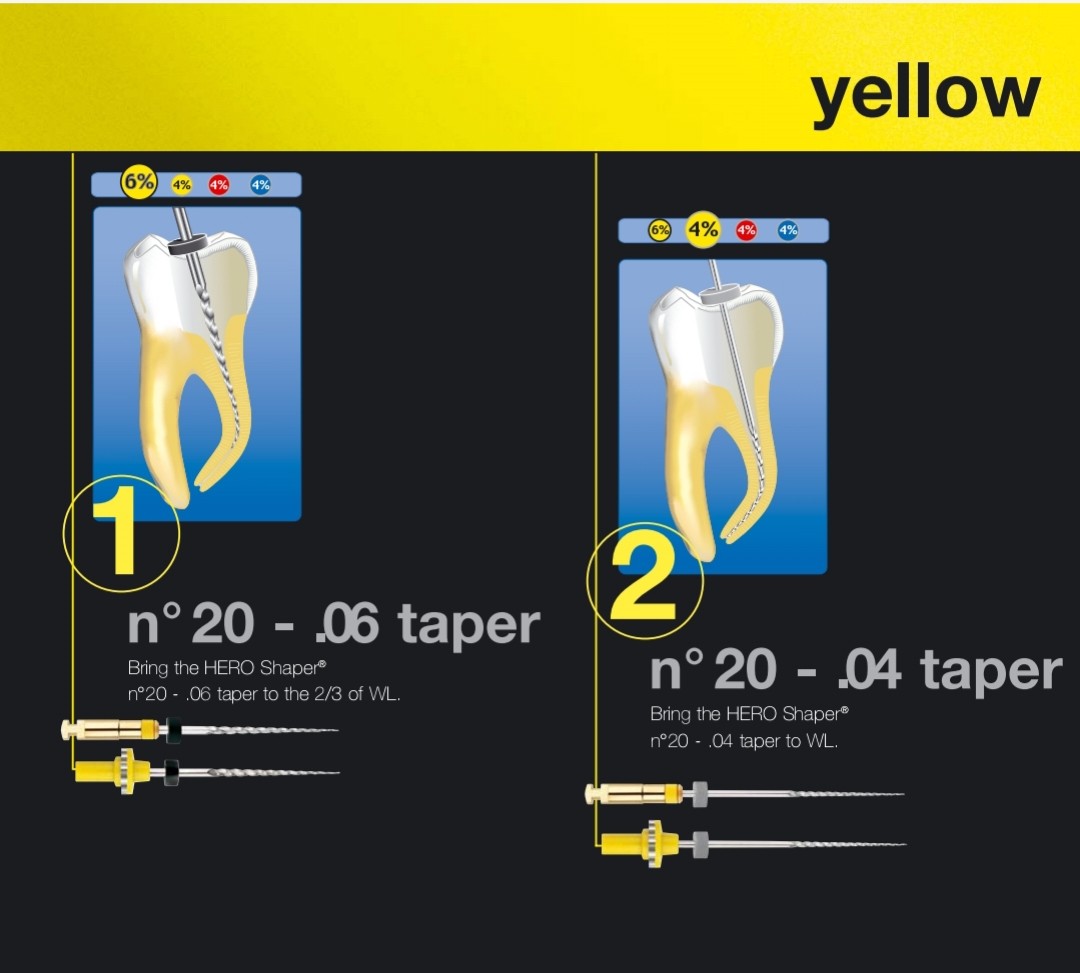 Hero Shaper files, with their pronounced tapers, are designed for use with the crown-down technique to progressively remove constraints and flare the canal. The coronal third is prepared using .06 taper Hero Shaper files and the apical third is prepared using .04 taper Hero Shaper files. The varying helical pitch and length of the cutting portion of the files provide them with an excellent combination of efficiency and flexibility. The main advantage of this file method is that it requires a reduced number of instruments to prepare a canal 2, 3 or 4 depending on the difficulty. This approach simplifies the process, reduces intervention time and minimizes the risks associated with the use of too many instruments, while maintaining precise and efficient canal preparation.