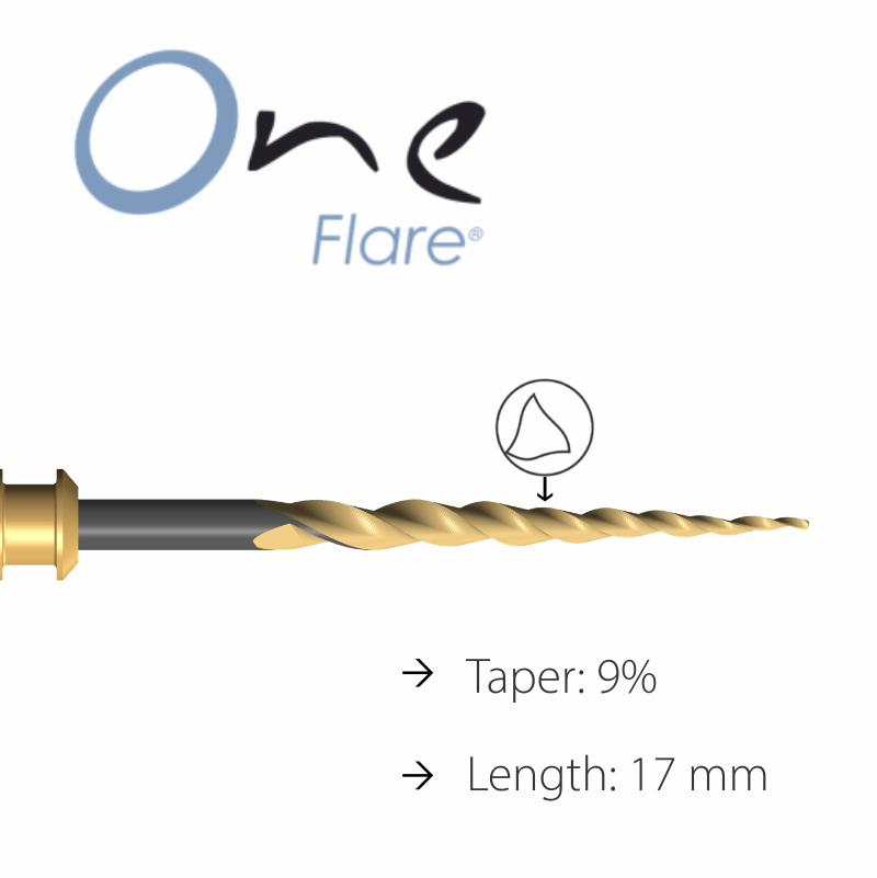 The One Flare file is a heat-treated NiTi T-Wire instrument designed to eliminate coronal-radicular constraints. This important first step ensures direct access to the canals, eliminates coronal-third constraints on the subsequent shaping instrument, and thus limits the risk of early fracture.