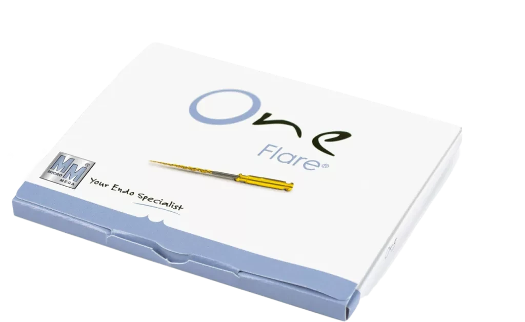 Micromega One Flare is a Nickel-titanium coronal flaring instrument. It is heat treated to improve fatigue resistance and increased flexibility. It is available as sterile blisters for multiple use. It has a non-working tip to prevent zipping. It eliminates interferences at the root canal entrance thus limiting no. of contact points of shaping instruments on root canal walls. This further helps in safe progression of glide path files for glide path creation and reducing risk of fracture for the succeeding shaping instruments