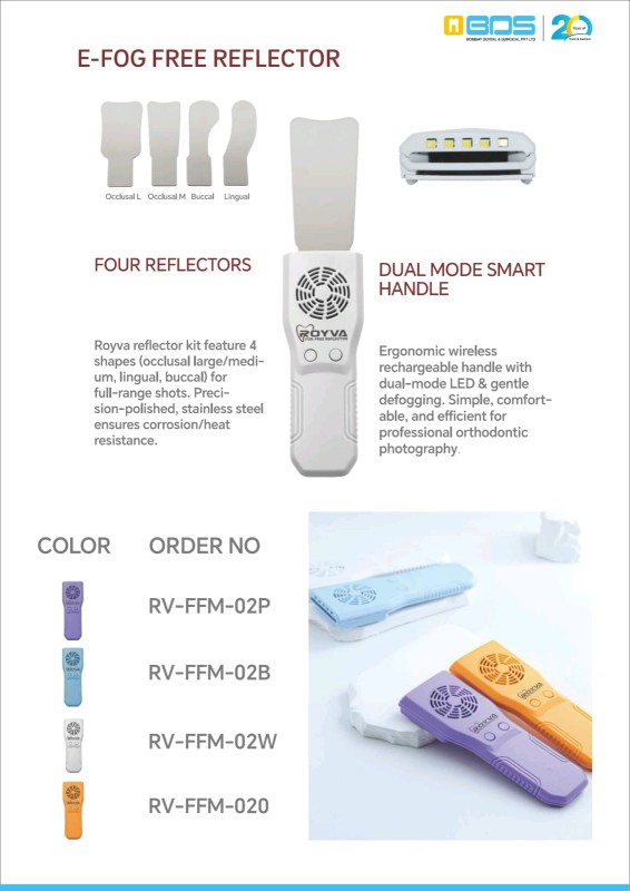 Royva E-Fog Free Photo Mirror System is a revolutionary solution to the frustrating problem of mirror fogging during dental photography. This innovative kit is designed to enhance your intraoral photography experience by providing clear visibility and direct lighting, ensuring accurate and detailed images every time. The Fog Free Mirror System features a compact ergonomic base which conveniently doubles as a handle during photography. The base incorporates a micro fan that effectively eliminates fog the moment your patient exhales, guaranteeing a crystal-clear view of the oral cavity. Say goodbye to the time-consuming and frustrating task of constantly wiping away fog from your mirror.