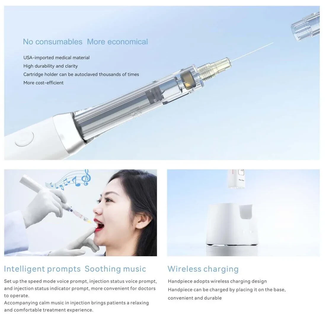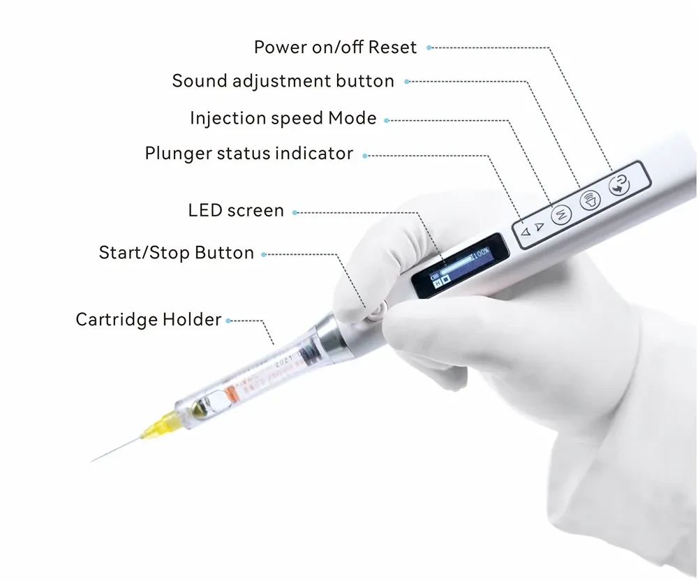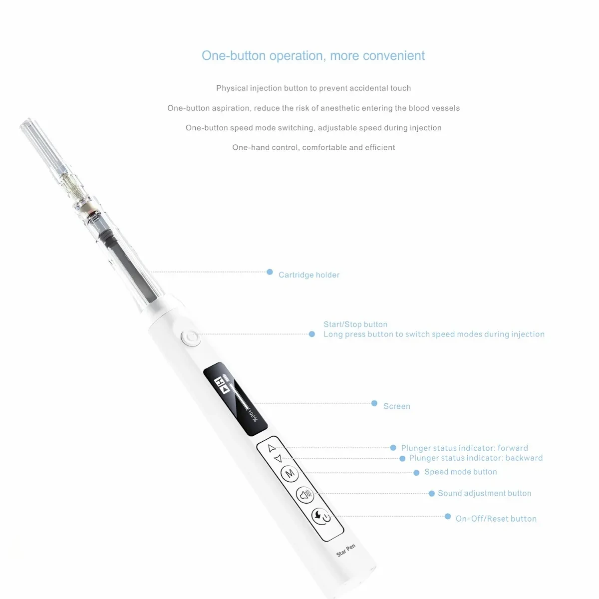 The Starpen consists of a handpiece, cartridge holder, and power adapter. The handpiece houses the necessary components for injection, while the cartridge holder securely holds the disposable injection needle. The device is compatible with standard local anaesthetics and syringe needles, making it a versatile tool for dental professionals. Two of the standout features of the Starpen are its one-key start function which enables quick and hassle-free operation and Unique Aspiration mode which helps to deliver Nerve Blocks with ease and safety.